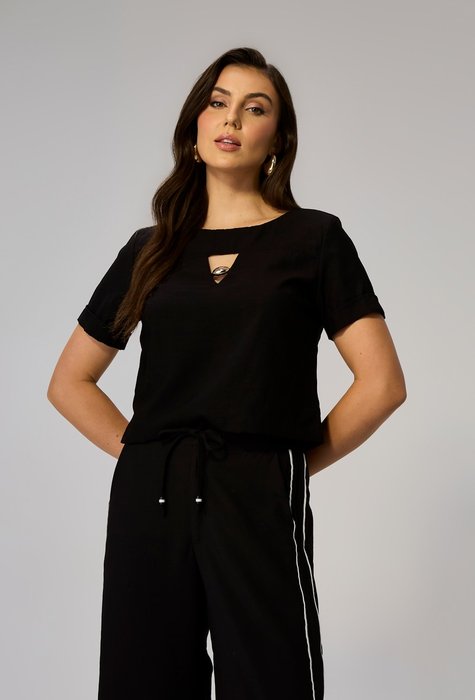 Com design exclusivo, o destaque fica por conta do decote delicado com acessório decorativo, que adiciona charme e personalidade à peça. O acessório aplicado confere um toque de sofisticação, valorizando o colo de forma sutil e elegante, sem exageros.