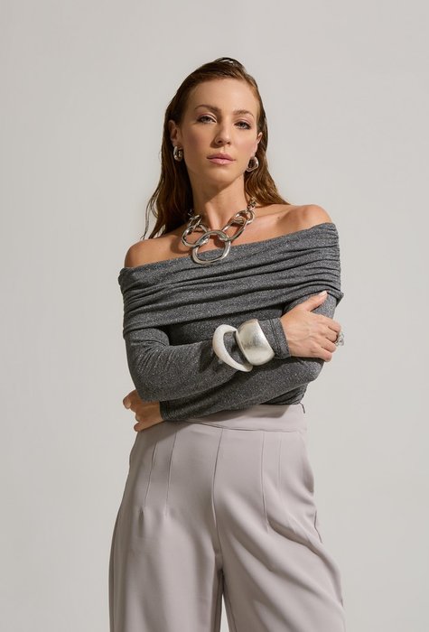 A Blusa Ombro a Ombro Metalizada é puro charme e atitude! Com um caimento impecável e tecido leve com acabamento metalizado, ela garante destaque em qualquer ocasião – do happy hour à balada.