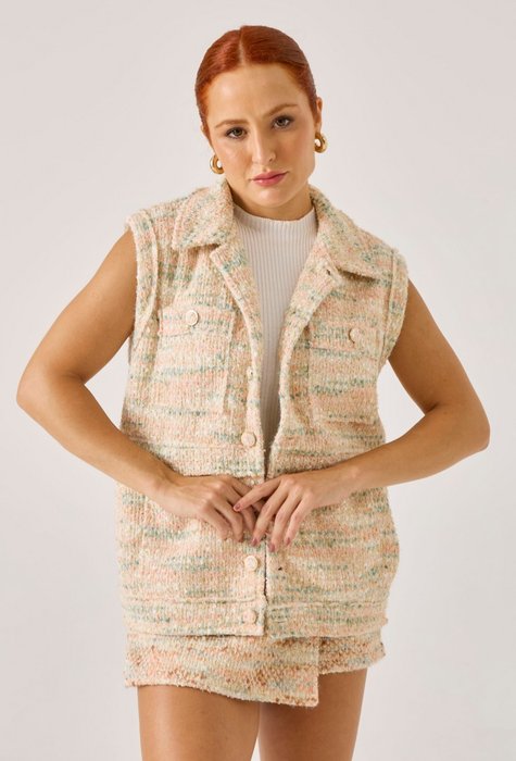 Com um design que valoriza a forma feminina, esse colete é projetado para realçar a beleza da mulher que o usa. A malha tweed é um detalhe que adiciona um toque de elegância e sofisticação, enquanto o estilo colete proporciona uma sensação de conforto e versatilidade. Além disso, o colete é confeccionado com materiais de alta qualidade, garantindo durabilidade e resistência.