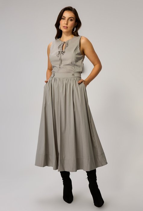 A saia ampla oferece um caimento impecável, proporcionando liberdade de movimento com um toque de sofisticação. Ideal para compor looks casuais ou mais formais.